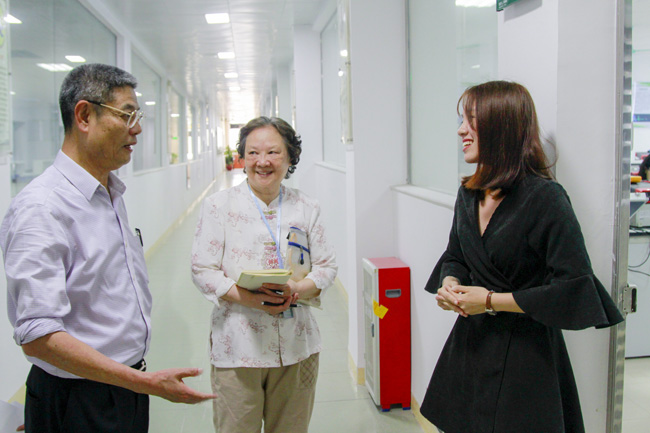 罗蔚茵督导(中)、廖振亮副校长(左)在与任课教师交流
