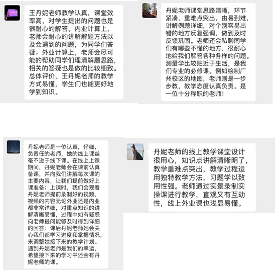 王丹妮认真负责的教学态度,灵活高效的教学方法,收获了同学们的好评。她表示学生的认可是她工作的最大动力,十分期待在新学期与同学们一起重回校园学习。