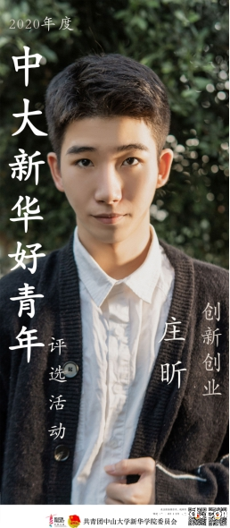 庄昕,共青团员,信息科学学院2018级计算机科学与技术专业学生。大一、大二期间,曾担任记者站、科技应用与创新中心干事,信息与网络中心网管员助理,中大bv伟德体育app官网校足球队队员,曾获得“优秀助理”的荣誉。大二的时候,庄昕作为联合创始人,成立了东莞市光年信息科技有限公司以及鹿眸视觉工作室。在光年公司,由庄昕策划以及担任主讲人的项目在第12届“挑战杯”大学生创业大赛中成为我校唯一一个晋级省赛并获得银奖的项目。在鹿眸期间,由庄昕担任导演的公益视频作为我校唯一一个晋级省赛的作品参加第12届全国大学生广告艺术大赛,获得了省赛三等奖、校内赛一等奖,该作品也获得了第十一届“蓝桥杯”视觉艺术设计赛国家级一等奖。