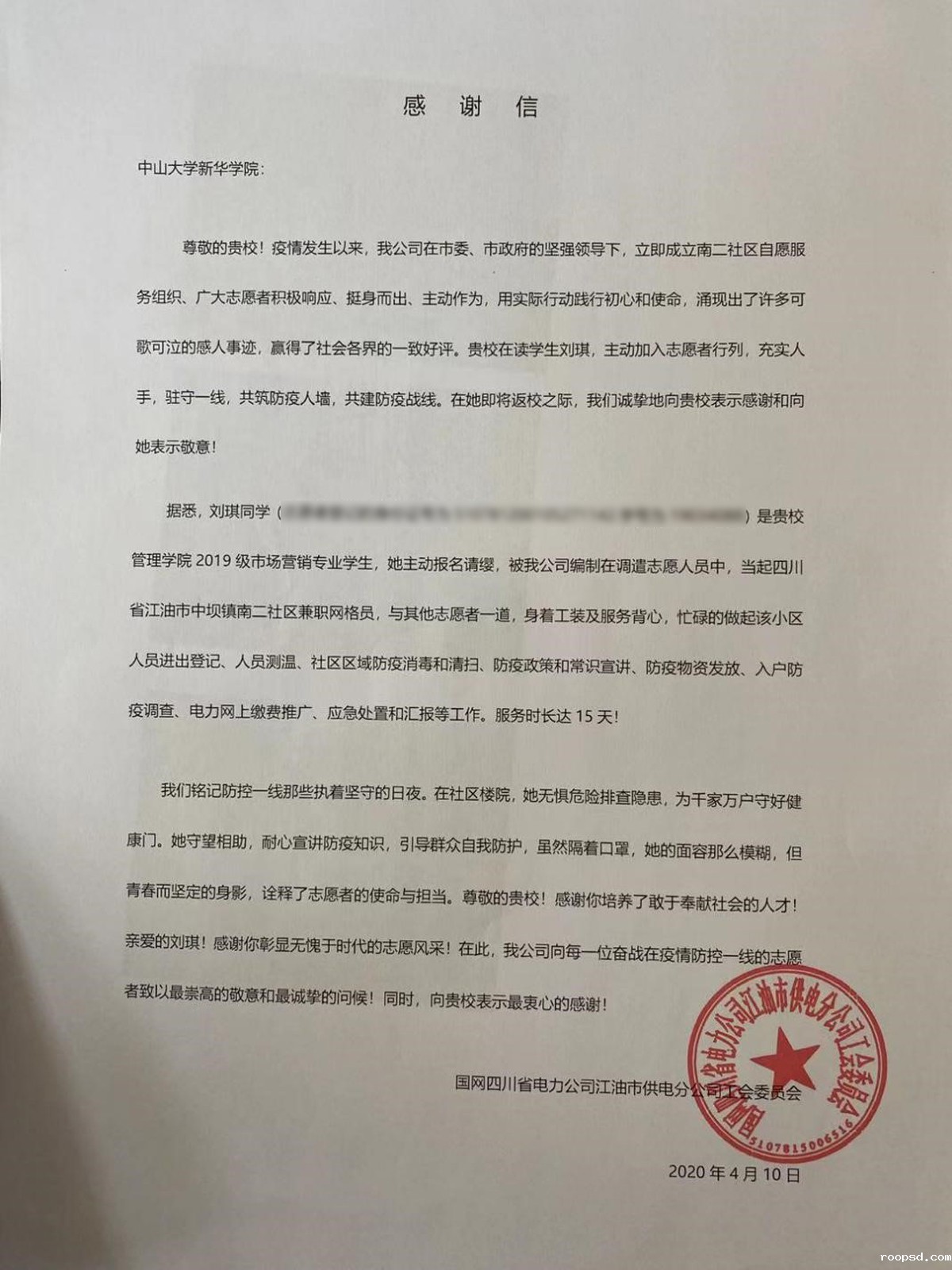 2021年1月16日,收到一封来自国家电网四川省电力公司江油市供电分公司工会委员会的感谢信。信中,对我校管理学院2019级市场营销专业学生刘琪在疫情期间积极参与志愿活动表示了感谢和赞许。