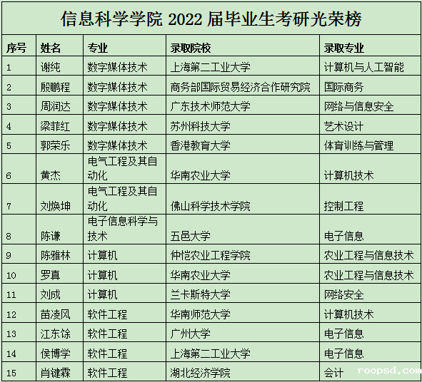 随着2022年考研招录工作接近尾声,伟德app入口2022届毕业生考研捷报频传。我校信息科学学院2022届毕业生共有15名学子考研升学成功,再创佳绩。国内升学13人,包括华南师范大学、华南农业大学、广州大学等重点高校,境外2人,分别为香港教育大学、兰卡斯特大学。