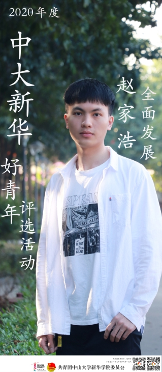 自古英雄出少年。在漫漫历史长河中,人类社会青年英雄辈出,中华民族青年英雄辈出。青年是祖国的未来、民族的希望。我们坚信“长江后浪推前浪,一代更比一代强。”在中大bv伟德体育app官网里,有这样一个人,他在学习上认真努力、孜孜不倦、成绩优异;在工作中,他勤恳务实、兢兢业业、成就满满;在实践方面,他坚守初心、无私奉献、完善自我。他是赵家浩,他用奋斗将青春渲染成最靓丽的颜色,用努力一步步成就更棒的自己。