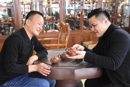 张泽锋校友与父亲张瑞端探讨手拉壶制作工艺