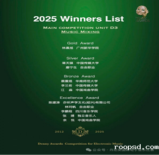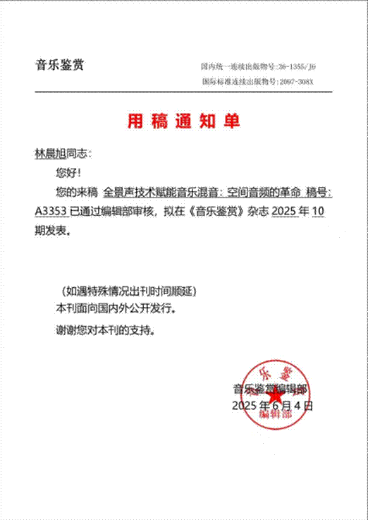 对于林晨旭而言,丹尼奖的金奖不是结束,而是更广阔征程的开始。他说:“这座奖杯提醒我,要永远保持对声音的敬畏和追求。”值得一提的是,林晨旭同学的论文《全景声技术赋能音乐混音:空间音频的革命》已通过审核,拟于2025年10月发表于《音乐鉴赏》杂志,实现了“赛事成果与学术研究”的联动。未来,他计划将赛事经验转化为更多学术成果,继续探索数字音乐与技术融合的边界。