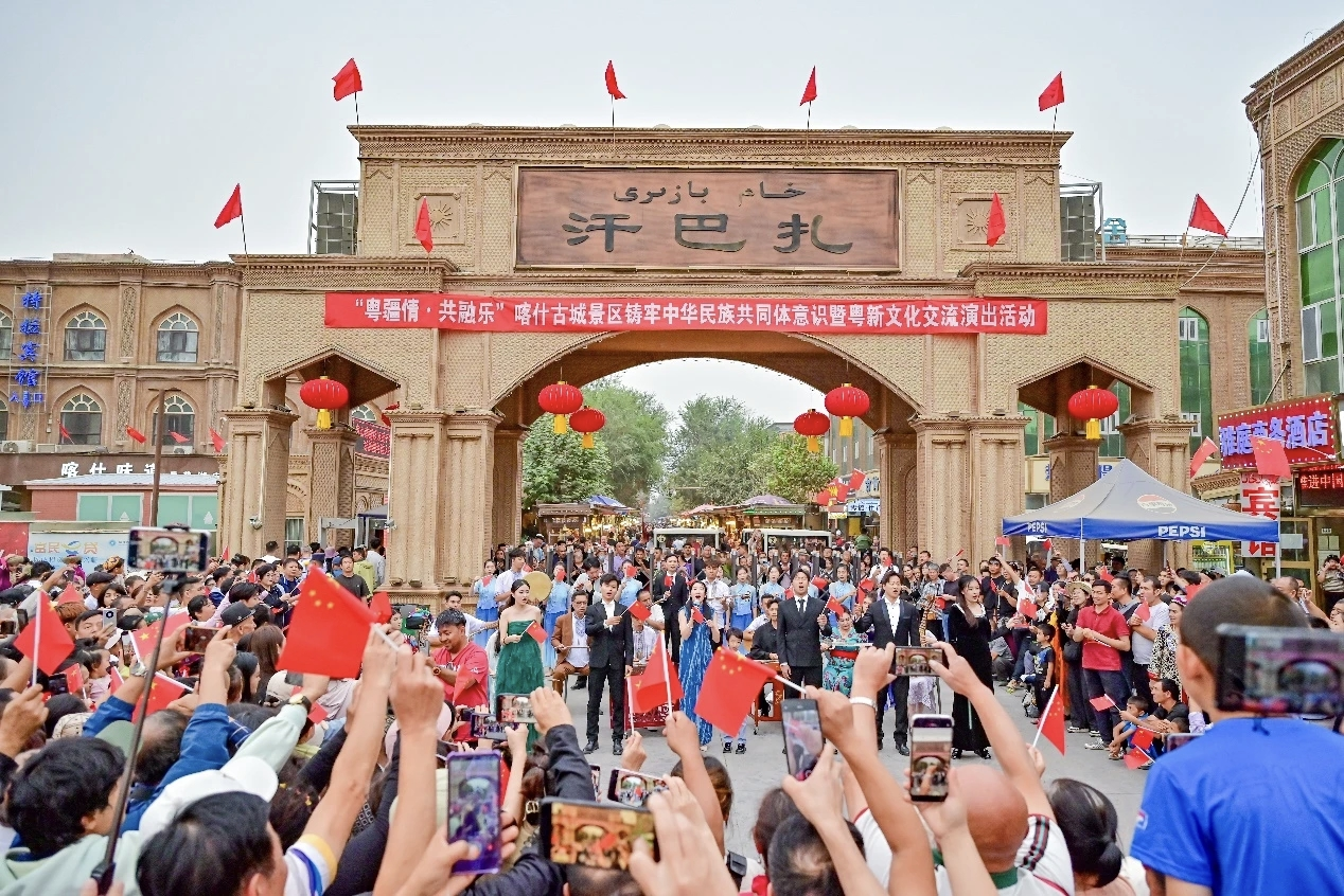 音乐系教师代表团赴喀什参加“粤疆情·共融乐”演出。三场晚会以舞蹈、合唱、独唱、琵琶独奏和广东五架头等多样形式,展现了岭南与新疆文化的交融,成为民族团结与文化交流的生动注脚。“粤疆情·共融乐”不仅是一场艺术盛会,更是在新疆维吾尔自治区成立70周年的背景下,一次民族团结与文化援疆的深情实践,寄托着粤疆两地人民心手相连、情感共融的美好愿景。