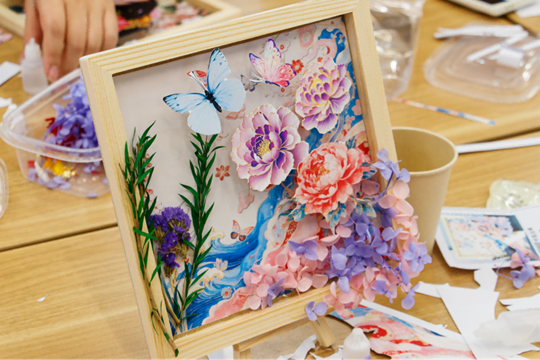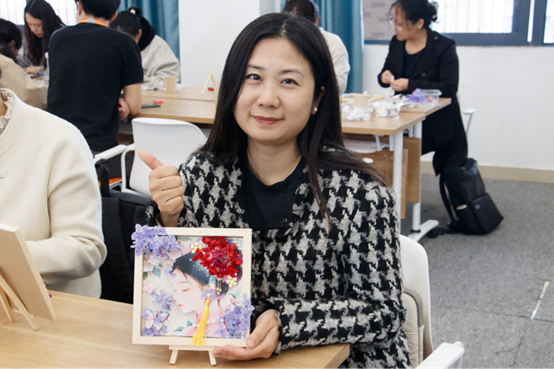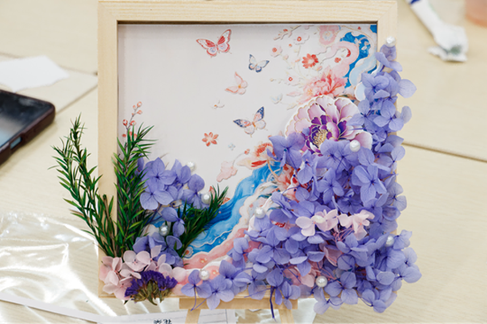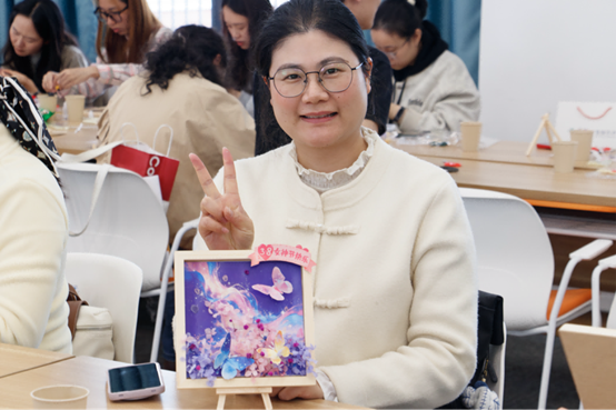经过一个多小时的精心制作,一框框精美的永生花作品陆续诞生。每一件作品都凝聚着女教职工们的巧思与耐心,展现了她们细腻柔美、热爱生活的一面。大家手捧自己的作品合影留念,脸上洋溢着幸福的笑容。