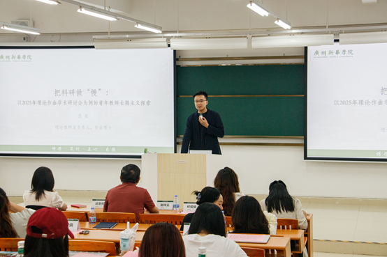 易南则以“把科研做‘慢’”为题,结合参与2025年理论作曲学术研讨会的亲身经历,深入阐述了青年教师应当秉持长期主义理念、摒弃闭门造车式研究的独到见解。他详细介绍了在研讨会上展示的长征主题音乐创作成果,并系统回顾了硕士阶段在数字化、自动化处理等领域的学术积淀。作为一名扎根基层的青年教师,他呼吁同仁们保持平和心态,在专注教学本职工作的同时,稳步推进科研探索的步伐。