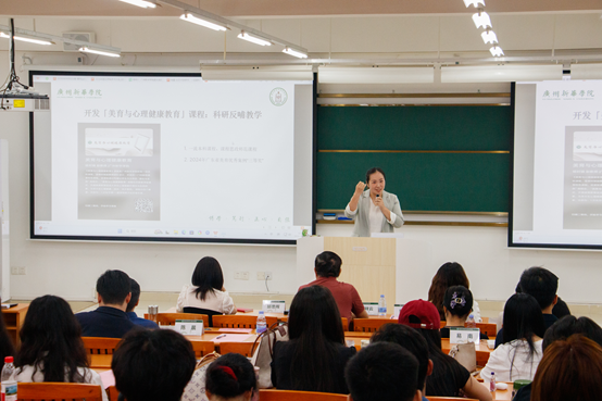 杨时娟以“扎根本职工作,在实践中开展科研探索”为题,阐述了“懂政策、会凝练、坐得住”三点重要经验。她指出,个人的职业发展得益于学校提供的各项政策支持与竞赛平台,其研究以客家文化、课程思政、美育为三大主线,先后获得省级教学奖项、全国美育大赛二等奖,并参与了学校的“博跃计划”。她建议教师充分利用学校人才培养计划,从教学实践中凝练研究课题,同时保持专注与耐心,主动向资深专家请教。