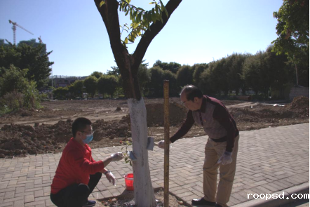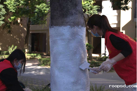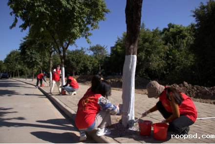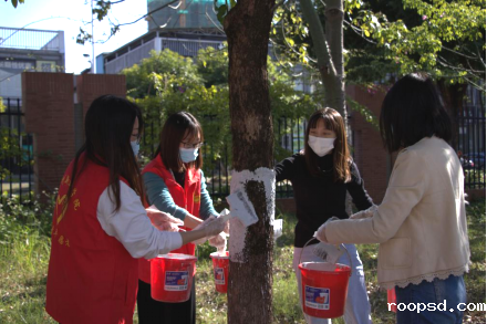 大家纷纷挽起袖子,一手提着涂料小桶,一手拿起刷子,弯着腰,有条不紊地刷着石灰。石灰溅到了衣服上,大家也丝毫不在意,反而把它当作勋章,更加热情地工作。大家热情高涨、干劲十足,在指定区域齐心协力、互帮互助,认真细致地对区域内所有树木进行规范粉刷。每一把刷子,都承载对树的诺言,每一颗心,都在默默温暖寒冬。大家一边工作一边讨论“为树添衣”的重要意义,一起期待着来年小树能茁壮成长,盼望老树能抽出新芽。