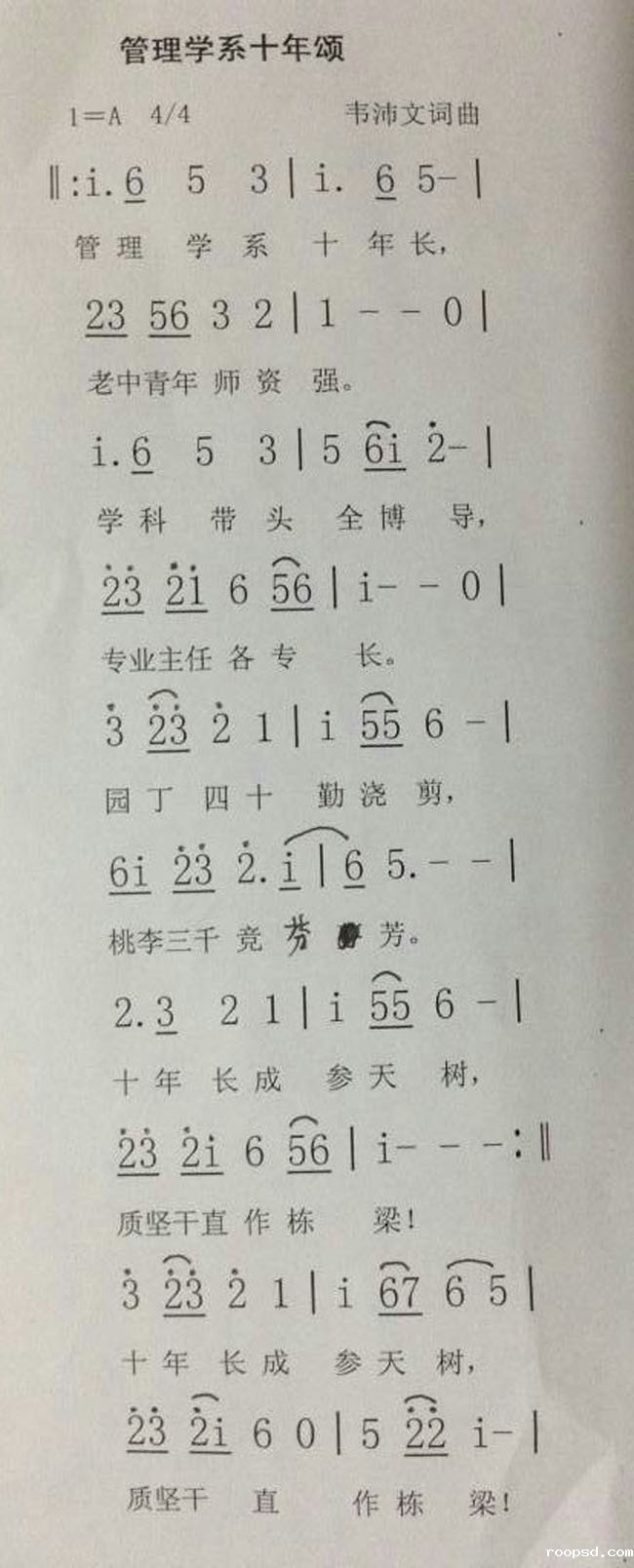 为祝贺我院成立10周年,响应学院十周年的相关庆典活动,我系系主任韦沛文教授以学院成立10周年为词曲背景,亲自作曲填词,谱写我系办学特色,以歌赞颂师生为院系办学所做出的努力和奉献以及所取得的成绩。由此,我系全体教师一致推举此曲作为我系的系曲,以献学院贺学院成立10周年,同时也以此作为我系的文化积淀成果之一,激励一届届的管理学系人。