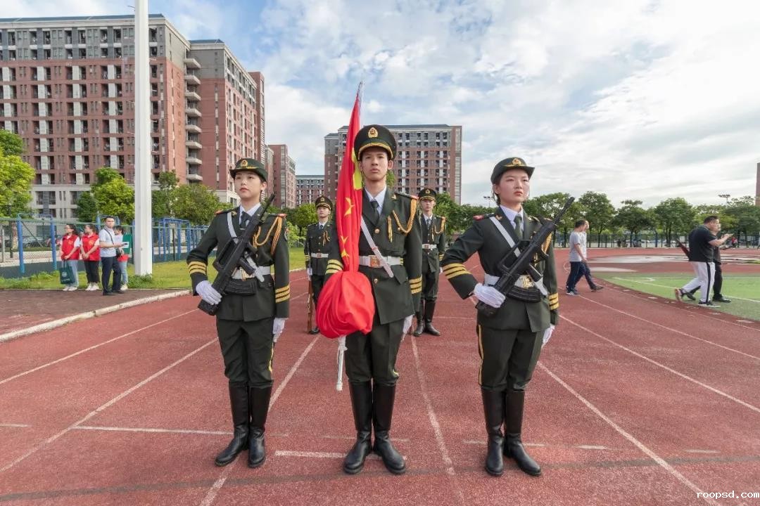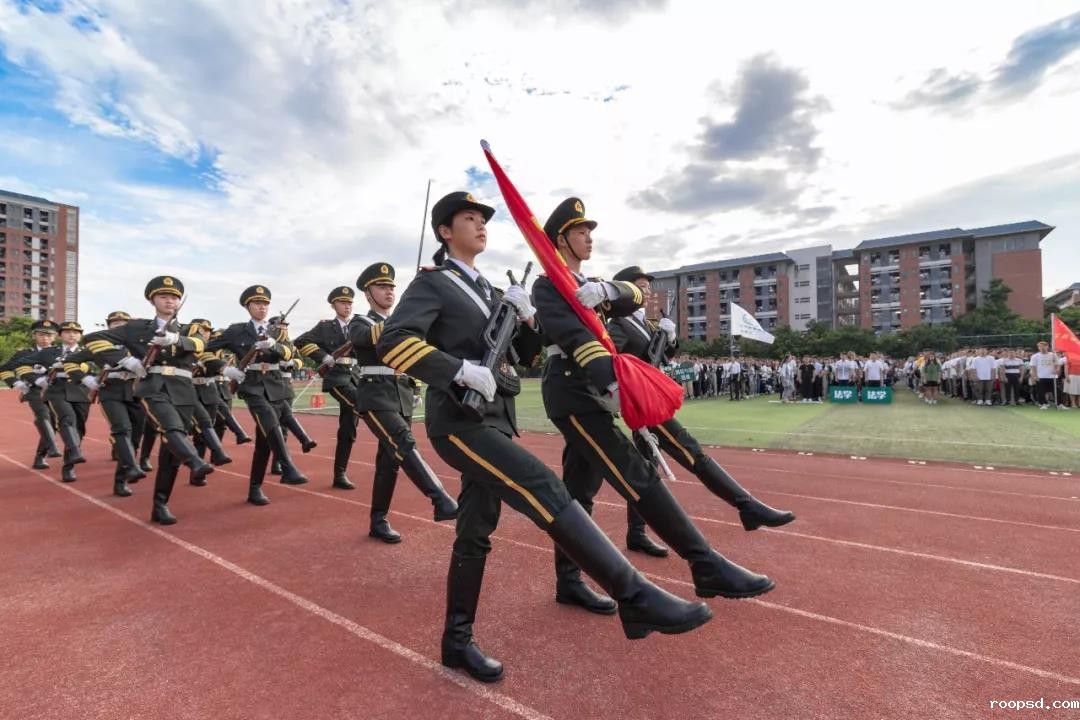 国旗护卫队身着绿装,昂首阔步地走向升旗台