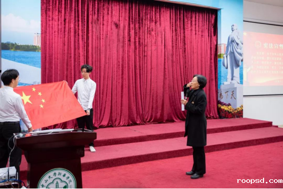 “我宣誓:忠于中华人民共和国宪法,维护宪法权威,履行法定职责……为建设富强、民主、文明、和谐、美丽的社会主义现代化强国努力奋斗!”在李岚教授的领誓下,全体师生举起右手握拳,一起面向宪法和国旗庄严宣誓。