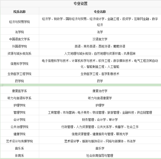 ●截至2021年6月,学校共开设53个本科招生专业(含1个创新班,2个方向班),涵盖经济学、法学、教育学、文学、理学、工学、医学、管理学、艺术学9个学科门类。互联网金融、智能制造工程、风景园林、书法学为2021年新增专业。
