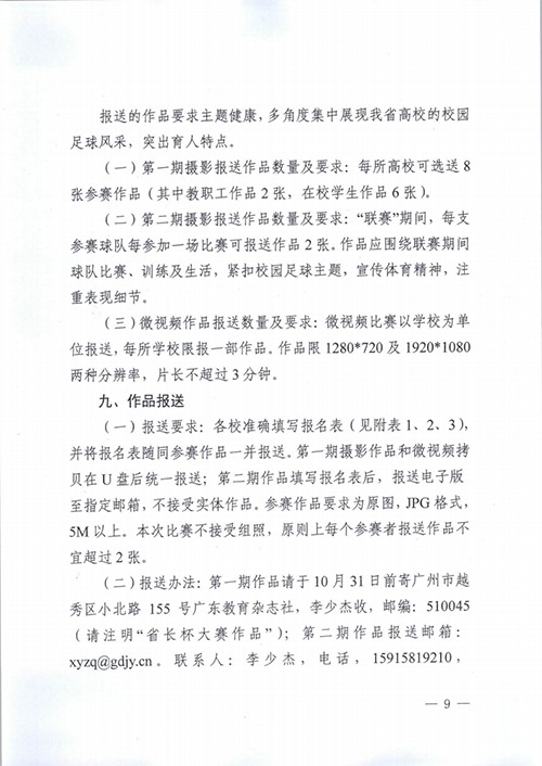 四、请有意愿参与第一期比赛的师生于10月27日前将作品电子版拷贝在U盘提交至宣传与新闻中心办公室,有意愿参与第二期比赛的师生于11月20日前将作品电子版发送至邮箱:XHXW2014@163.COM(邮件名:广东省校园足球摄影、微视频及征文大赛参赛作品)提交至宣传与新闻中心办公室,宣传与新闻中心和体育部将择优向省教育厅推荐参赛。