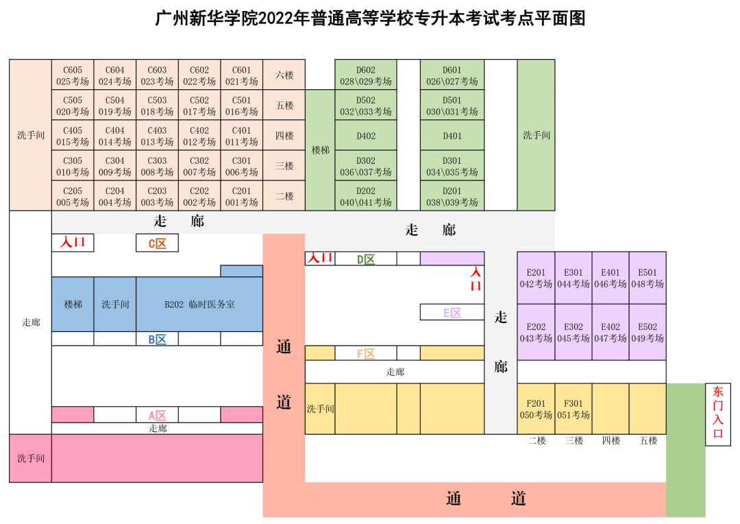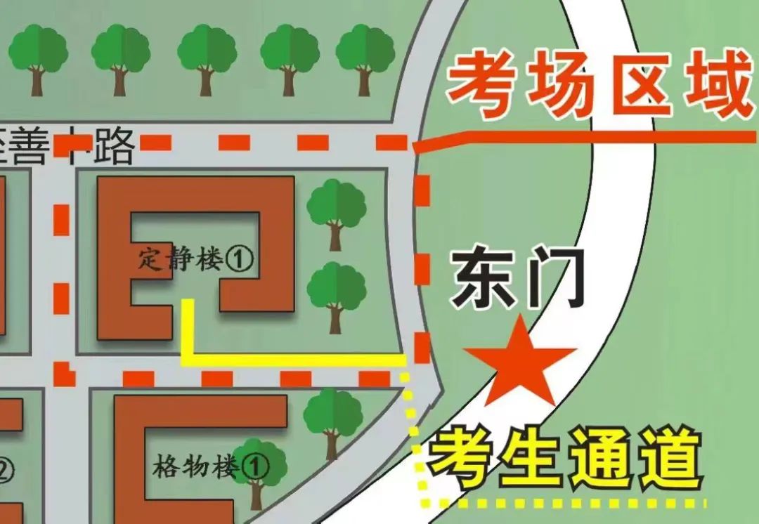 (东莞校区)东门进入考点(考生车辆不得进入)。进入考点前扫场所码,出示准考证、行程卡、考前三天(4月24、25、26日)的3天2检记录、24小时核酸检测阴性证明。