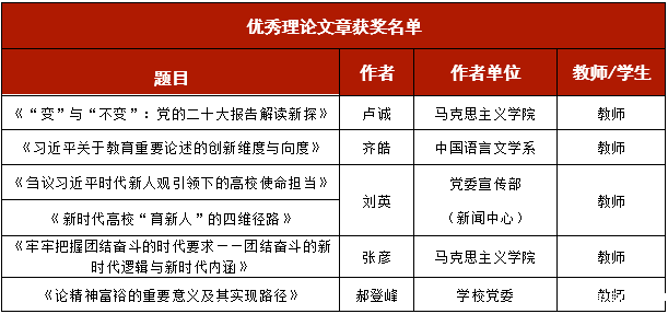 2022年10月-2023年3月,学校党委在全校师生中开展“学习宣传贯彻党的二十大精神”主题征文活动。近日,党委宣传部(新闻中心)本着公平公开公正的原则,组织评委专家评选出6篇优秀理论文章和3篇优秀学习心得,现将名单公布如下:
