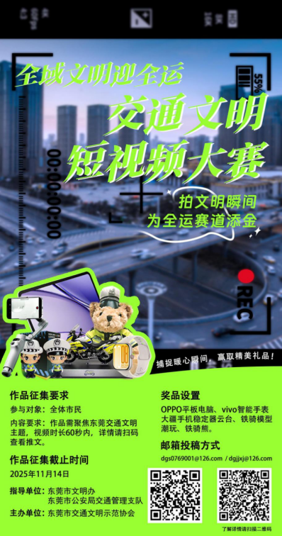 为迎接第十五届全运会,深入推进东莞市交通文明建设,营造“全域文明迎全运”的浓厚氛围,在东莞市文明精神建设办公室、东莞市公安局交通管理支队指导下,东莞市交通文明示范协会主办了“全域文明迎全运·交通文明短视频大赛”,现将有关事项通知如下: