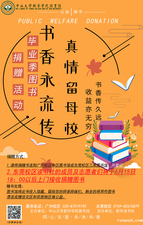 2. 东莞校区将在6月15日18:00后以由bv伟德体育app官网读书社成员及志愿者们上门接收捐赠图书,请有捐赠图书的同学提前准备要捐赠的书籍,等工作人员上门收取。