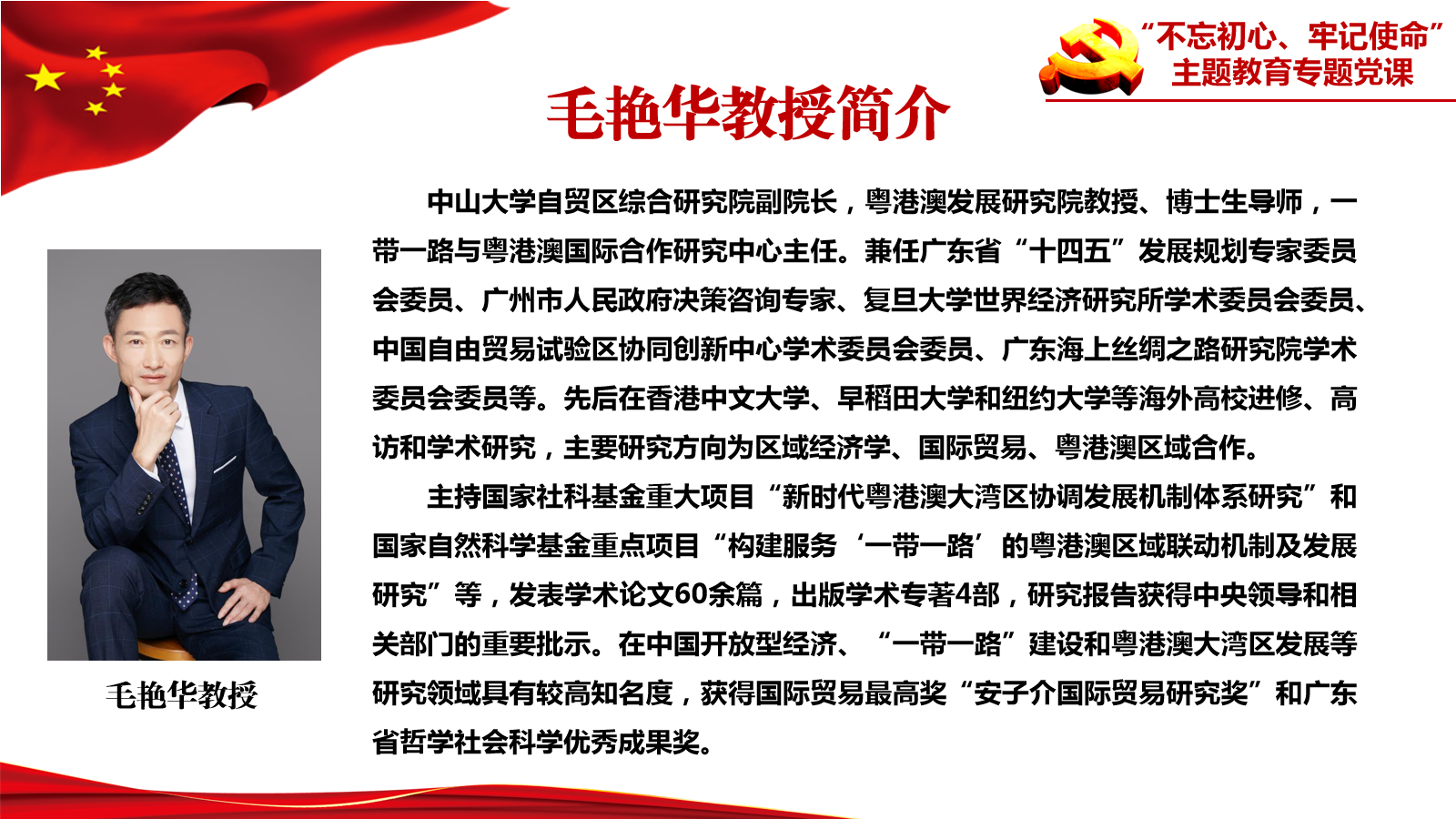 主讲人:毛艳华教授(中山大学自贸区综合研究院副院长、粤港澳发展研究院博士生导师、一带一路与粤港澳国际合作研究中心主任)