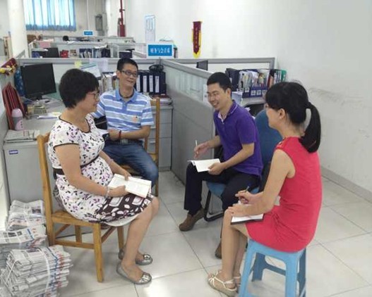筹备现场:左一李安兰老师、左二林源老师、右一伦妙兴老师、右二陈文川老师
