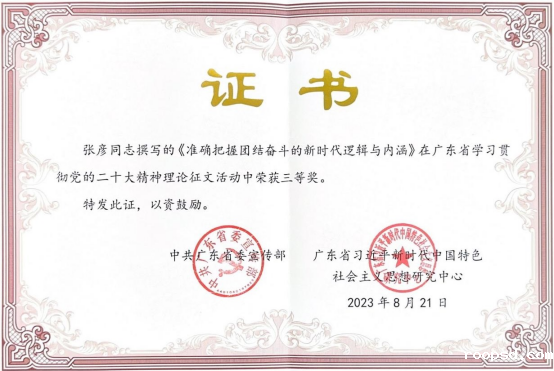 近日获悉,2022年12月由中共广东省委宣传部、广东省习近平新时代中国特色社会主义思想研究中心举办的广东省学习贯彻党的二十大精神理论征文活动中,我校马克思主义学院张彦博士撰写的《准确把握团结奋斗的新时代逻辑与内涵》一文荣获三等奖,这是我校深入学习贯彻党的二十大精神,持续推动习近平新时代中国特色社会主义思想融入教育教学取得的一个重要成果。