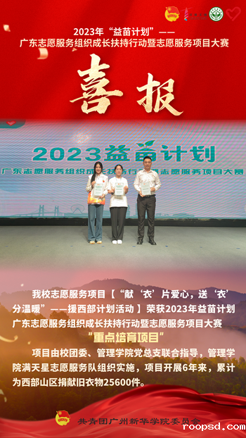 11月10日,由伟德app入口校团委、管理学院党总支联合指导的满天星志愿服务队,开展的志愿服务项目“献‘衣’片爱心,送“衣’分温暖——援西部计划活动”荣获2023年“益苗计划”广东志愿服务组织成长扶持行动暨志愿服务大赛“重点培育项目”。