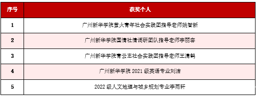在省委宣传部、省文明办、团省委、省教育厅、省学联对2023年广东大中专学生志愿者暑期文化科技卫生“三下乡”社会实践活动暨广东青年大学生“百千万工程”突击队行动的评选中,我校荣获省级“优秀组织单位”荣誉称号,4支团队获得优秀团队称号,5人获得优秀个人称号。