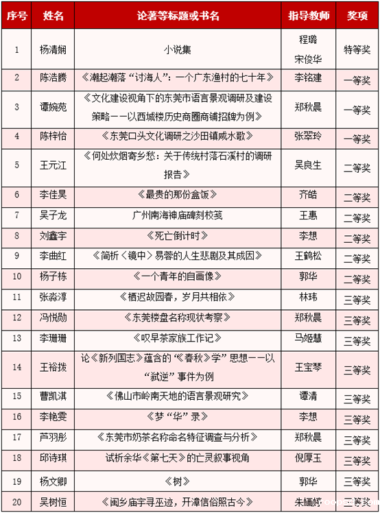 在本次广东省大学生写作大赛中,学校中国语言文学系师生的多部作品凭借独特的创意和扎实的文学功底,在众多参评作品中脱颖而出,喜获佳绩。其中,中国语言文学系2021届校友杨清娴荣获“特等奖”;19名在读学生分别荣获一二三等奖;程露、李铭建、郑秋晨等16位老师获“优秀指导教师”奖;李国斌老师的“小小说写作艺术”获“广东省写作学会教学成果二等奖”。