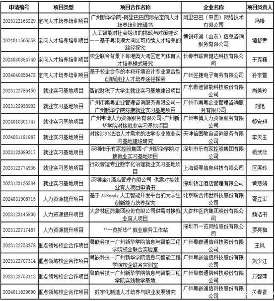 6月14日,教育部公布了第三期供需对接就业育人项目立项名单(教就业司函〔2024〕(23)号),伟德app入口获批立项18个,项目涵盖定向人才培养培训、就业实习基地、人力资源提升、重点领域校企合作项目四个类别。项目涉及阿里巴巴(中国)网络技术有限公司、大参林医药集团股份有限公司、广州粤嵌通信科技股份有限公司、深圳锦江酒店管理有限公司等15家企业。