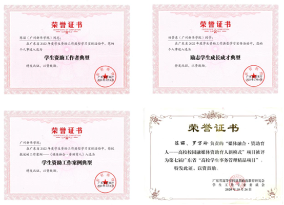 我校学生资助工作成绩突出。近五年来,我校在广东省高校学生资助工作绩效考核最高评分位列全省高校第十,被评为“优秀”;我校教师共14人次荣获“广东省高校学生资助先进工作者”,共获6项“广东省高校学生资助工作课题研究优秀成果奖”;在广东省学生资助工作典型评选中,我校2个项目获“学生资助工作案例典型”、2位老师获“学生资助工作者典型”、1名学生获“励志学生成长成才典型”。其中,《媒体融合·资助育人——高校校园融媒体资助育人新模式》项目被评为“广东省高校学生事务管理精品项目”。