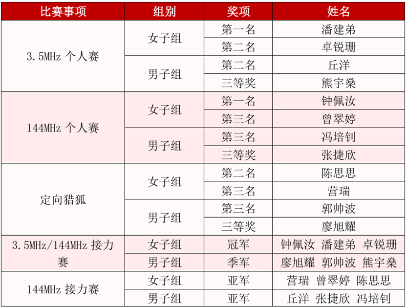 无线电测向队在体育系主任倪依克的带领下,由教练员林健、卢俊兵两位老师指导,共派出12名队员参赛,最终在3.5MHz个人赛、144MHz个人赛、定向猎狐以及多个接力赛项目中荣获多项第一名、第二名、第三名及团体奖项,成绩斐然。