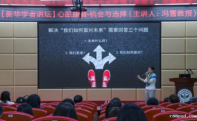 讲座伊始,冯雪播放了《回家》的短片视频,为在座的师生们分析和介绍了心脏康复事业的现状以及未来的发展。冯雪以“我们如何面对未来”为话题展开了今天讲座的内容,首先提到了医学事业的未来有无限可能,也会有无限的困难,并为同学们讲述未来的医学知识体系面临的机会和选择。