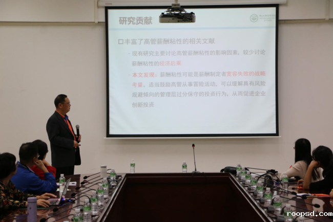 刘运国院长首先指出题目和创新在论文中的重要性,并以十九大报告、五大创新理念的例子为切入点进行深入分析指出,高管薪酬存在一定的粘性,这种粘性的存在是因为薪酬制定者本身具有“奖优不惩劣”的倾向,“宽容失败”能够增强组织的凝聚力和团队成员的上进心,得出高管薪酬粘性在一定程度上是薪酬制定者容忍高管失败的一种有意安排的结论。