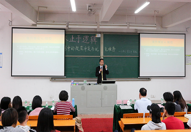 11月21日上午,由我校学科与科技管理处、法学院承办的学者讲坛在东莞校区定静楼②A201顺利开展,法学院兼职教授曾志平应邀担任主讲嘉宾,讲座题目为“口水止于逻辑——彭宇案中的规范冲突和优先顺序”。