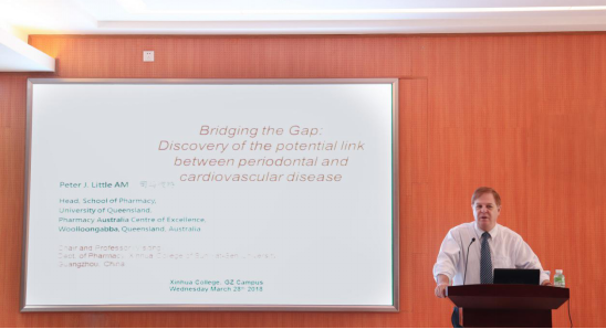 学院(以下简称学校)主办、学科与科技管理处和药学院共同承办的主题为“Discovery of the potential link between peridontal and cardiovascular disease”的讲座在广州校区第一会议室举行。王庭槐校长特邀澳大利亚昆士兰大学药学院院长、我校药学院首席教授Peter J. Little教授担任本次讲座的主讲嘉宾,药学院办公室主任曹颖男主持讲座,Little教授夫人应邀出席,药学院党总支副书记陶强及药学院师生代表共同参与此次讲座。