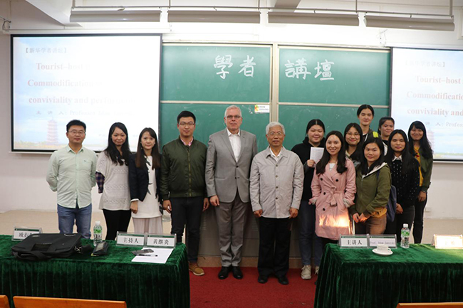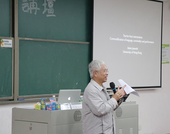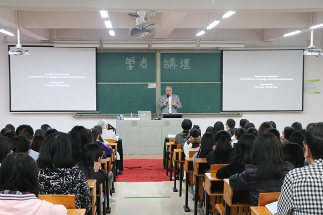学者讲座在东莞校区举行。此次讲座诚邀香港大学教授Adam Jaworski担任主讲嘉宾,讲座主题为Tourist-Host of Interactions: Commodification of Language, Conviviality and Performance,外院副院长黄继炎主持讲座。外院英语专业副主任李贻、办公室主任欧衍伽,基础教研室主任袁侥蔚以及外院学子共同参加此次讲座。