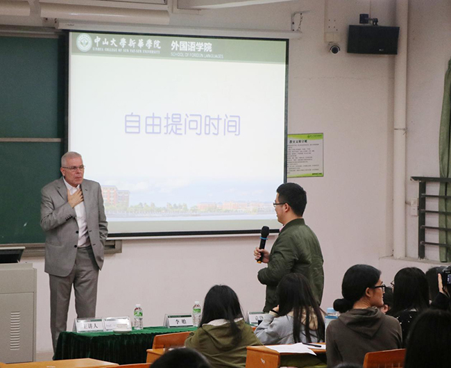 在自由提问交流环节中,外院师生相继向Jawosrki踊跃提问。 Jaworski耐心地对大家提出的问题发表了自己的意见及建议。其中,外院老师提出“关于各种翻译系统软件的出现对‘Language service’未来影响”的问题时,Jaworski表示如今翻译软件虽然方便快捷,但并不意味着可以将所有语言的含义都准确地表达出来。因为在翻译的过程中,人与人之间的讲话情绪、语境、肢体语言、文化背景等因素都可能对讲话内容产生不一样的影响,故机器在短时间内还无法完全取代人工翻译。