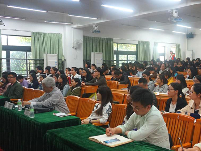 黄继炎副院长致欢迎辞,他首先向在座师生介绍了Jaworski教授,并希望同学们能够珍惜这次难得的讲座机会,认真听讲,学有所获。 Jaworski向同学们介绍了本次讲座的主题Tourist-Host of Interactions(旅游客主交互行为),并围绕Commodification of Language,Conviviality以及Performance三点主要核心内容进行详细的讲解。