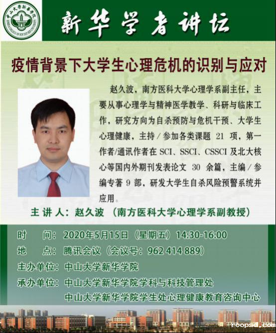 为深化师生对疫情背景下大学生心理状况的认识,促进学生工作人员以更加科学、专业、高效的方式开展学生返校前后的心理危机预防、识别与干预工作,我校心理健康教育咨询中心特邀南方医科大学心理系副主任赵久波副教授于5月15日开展了“疫情背景下大学生心理危机的识别与应对”线上专题讲座。心理咨询中心专兼职教师、各院系学生辅导员、党政管理干部等百余人参加学习。
