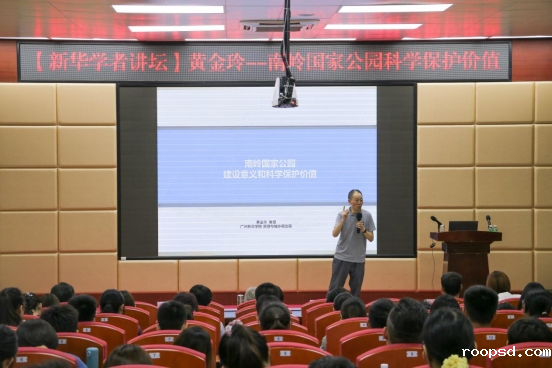 黄金玲结合我国生态文明制度建设、社会热点等内容,向师生简述了建设南岭国家公园的意义。在南岭国家公园的创建等各项工程中,科学保护的工作是重中之重,黄金玲从南岭国家公园的植被植物资源本底、野生动物资源本底、自然(地质)遗迹本底、游憩资源本底、自然生态系统、社区基本情况、自然属性等方面,为在场师生阐述了南岭国家公园的科学保护价值。