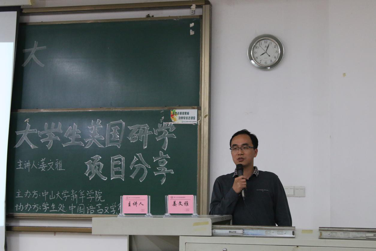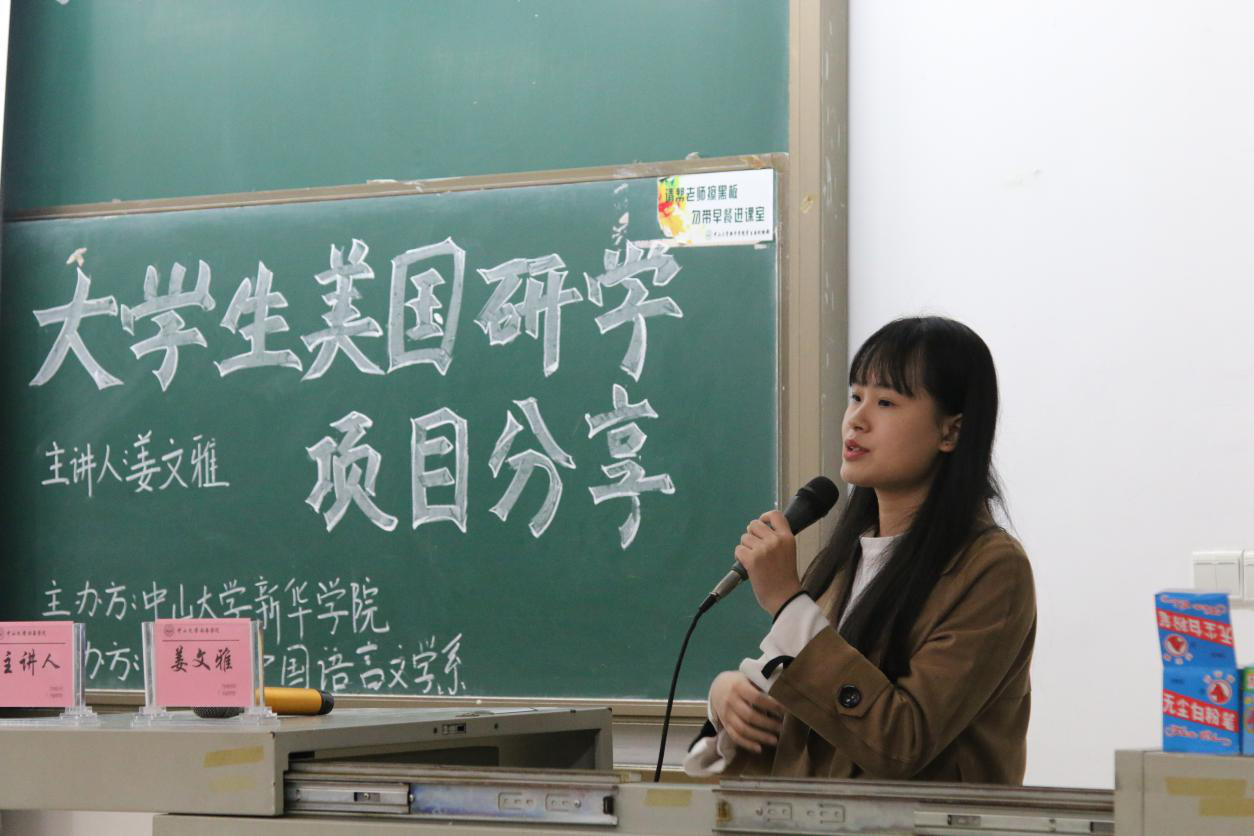学子了解“助梦扬帆”海外研习项目,更好地规划大学学习生活,3月7日,国家奖学金获得者、2015级中文学子姜文雅同学在东莞校区定静楼①D420作主题为“大学生美国研学项目分享”的学子讲坛。讲坛由中山大学