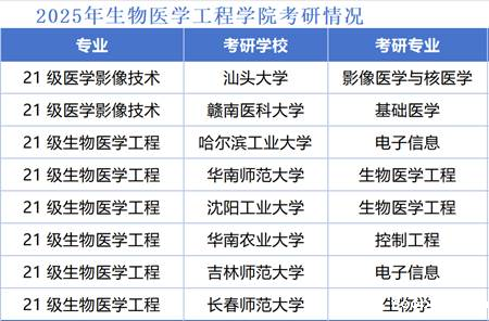 2025届毕业生总人数116人,13名考研学子中8人成功“上岸”,录取率达61.5%。学子们凭借扎实的专业素养和多元化的学术视野,被汕头大学、哈尔滨工业大学、南师范大学等“985院校”“211院校”和“双一流”高校录取,考研专业涵盖影像医学、电子信息、生物医学工程等多个领域,充分彰显了学院“厚基础、强实践、重创新”的育人特色。