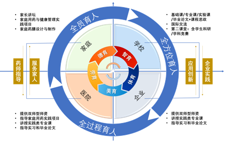 药学专业以培养德智体美劳全面发展的专业应用型人才为目标,以“家-校-院-企”协同实践教学体系为依托,构筑“三全育人,五育并举”的高素质应用型药学人才培养模式。重视学生“三基”及创新能力培养,构建“基础实践、综合实践、应用与创新”三大实践教学模块,努力推进产教融合、校企合作、协同育人。