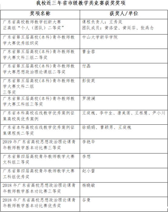 在校内教学竞赛的基础上,我校推荐优秀教师参加省、市级教学竞赛并获得奖项,其中教学大赛省部级8项,市厅级3项,校级109项;在线教学优秀案例市厅级2项,校级10项。近3年所获奖项包括,广东省高校教师教学创新大赛1项,广东省第五届高校(本科)青年教师教学大赛5项,广东省第四届高校青年教师教学大赛2项,广东省本科高校在线教学优秀案例2项,2019年度广东省高校思想政治理论课青年教师教学基本功比赛1项,2018年度广东省高校思想政治理论课青年教师教学基本功比赛2项。