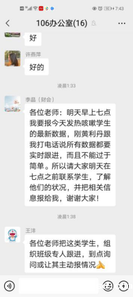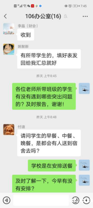 辅导员全天候投入疫情防控的相关工作,全力守护学院的学生,校园内可能看不到他们四处奔走的身影,但在微信、QQ、电话中他们却一直坚持在线在岗,想学生之所需,解学生之所难,做同学们最坚强的后盾!