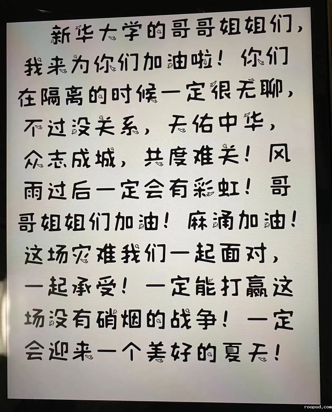 他们有的画一幅画、有的写祝福语、有的拍一段小视频……,用不同的方式鼓励他们坚定信心,克服困难,团结一致,战胜疫情。