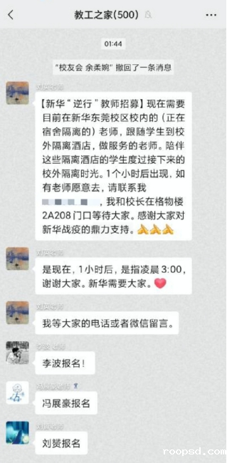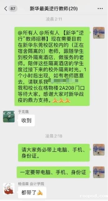 23日12时,首批关爱学生专班的吴翔老师到达隔离酒店后第一时间加入学生沟通群,向同学们传达学校的关爱和鼓励,号召同学们临危不惧,同心抗疫。