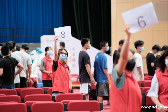 为维护检测现场秩序,学生志愿者们高举“爱的号码牌”,指引受检者有序进场,进行排队检测。