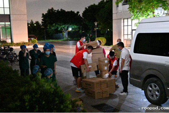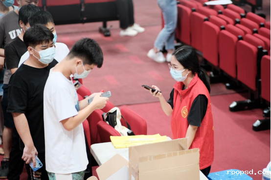 6月19日0时,学校总务处连夜准备相应物资,并做好东莞校区全员核酸检测现场的布置。凌晨4时,学生志愿者将核酸检测相关物资搬运至馆内。