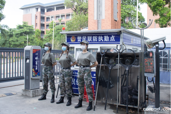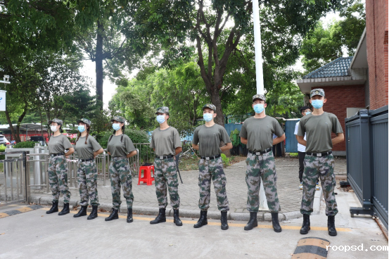 国旗护卫队在校门处协助值守,加强门防检查工作,维护校园秩序。